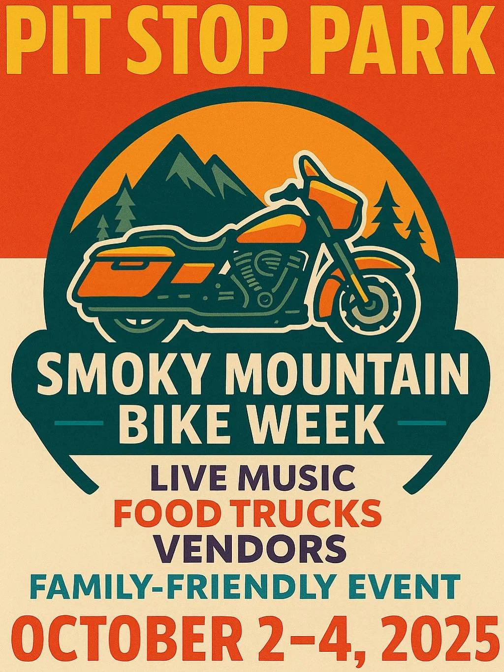 Pit Stop Park is the newest addition for Smoky Mountain Bike Week 2025 and aims to be the ultimate riders destination for motorcycle enthusiasts and adventure seekers visiting the Great Smoky Mountains during Smoky Mountain Bike Week. Located in the heart of East Tennessee, Pit Stop Park is within one hour of most rider attractions in East Tennessee (more about that below) and offers a historic downtown gathering place in Lenoir City to relax, refuel, and recharge with fellow riders. This unique venue features live music every night, an exciting variety of food trucks, vendors, and a laid-back atmosphere where stories are shared and memories are made. Whether you're rolling in solo or riding with your crew, Pit Stop Park is your go-to stop for good vibes, great eats, and great entertainment.